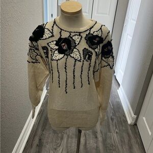 Stunning vintage-inspired cream sweater featuring bold black floral embroidery with sequin accents. The intricate detailing and textured knit give it an elegant, boutique feel. Lightweight yet cozy — perfect for layering or making a chic statement on its own.