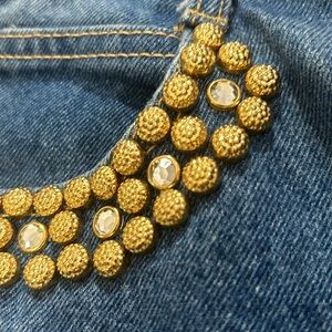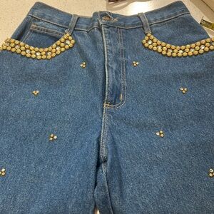 Vintage Cache Jeans. The perfect mom fit. So flattering on. Embellished with large gold studs around pockets & rhinestones & scattered throughout legs in the front.