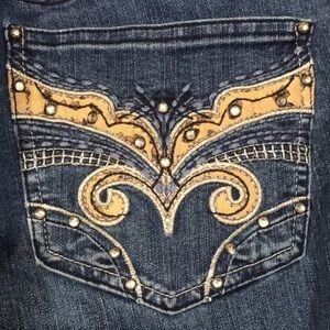 Cache Embroidered Embellished Pocket Medium Wash Flare Leg Jeans