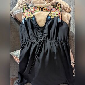 Gorgeous black halter with intricate floral embroidery. Gently worn with no visible flaws. Perfect with jeans and sandals on these hot summer days.
