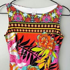 The Cache Floral Hawaiian Boat Neck Dress in size 2 is a stylish and vibrant option for women looking for a tropical-inspired outfit. The sleeveless design, knee-length hem, and flattering bodycon style make it perfect for summer and spring occasions. Made from a blend of polyester and spandex, this dress offers comfort and flexibility for travel or a party. The multicolor floral pattern and Hawaiian theme add a fun and playful touch to this eye-catching dress by Cache Cache.
