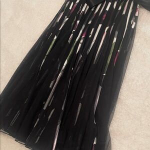 Elegant black midi dress with vibrant stripes. Perfect for special occasions. Features a chic bow detail.