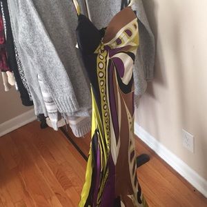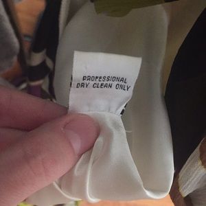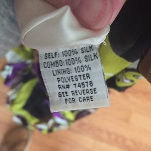 Perfect dress for prom, ball or a formal event! I bought this dress from Cache in 2008 and wore it for my Jr Prom, haven’t worn it since! Sry for the pics. I tried to find pics of me wearing it but they wouldn’t fit right! The pictures totally do not do it justice. This dress is gorgeous! Purple, green, brown and black pattern. Fitted on top with bra cups so no need to worry about finding a bra that works! Flowy on bottom. 100% silk dress 100% polyester lining. Just needs dry clean for wrinkles.