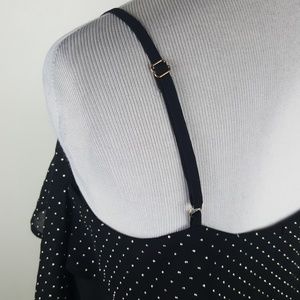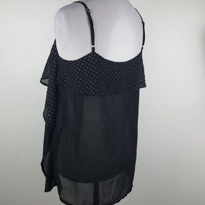 Cache black layered polyester chiffon blouse w/ adjustable spaghetti straps. Gold studded hardware on the straps Semi sheer bottom layer. Layer over bust is not see thru. Some minor glue spots from gold bejewels on the front layer shows in last photo. Can only be seen under my lights! Not noticeable!