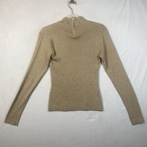 Elegant Caché gold metallic knit sweater in size Medium, featuring a mock neck with heavy faux-pearl and bead embellishment. Soft ribbed metallic fabric with a flattering fitted silhouette and back zipper closure. Perfect for holidays, evening events, or special occasion outfits.Measurements (approx):