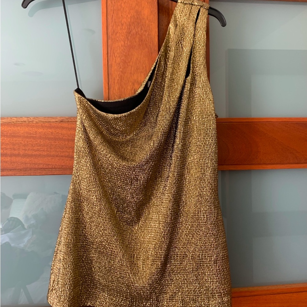 Elegant one-shoulder design. Shimmering gold fabric. Perfect for evening wear.