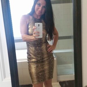 Elegant gold snakeskin midi dress with a striking pattern. Perfect for making a statement.