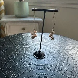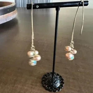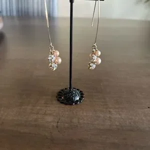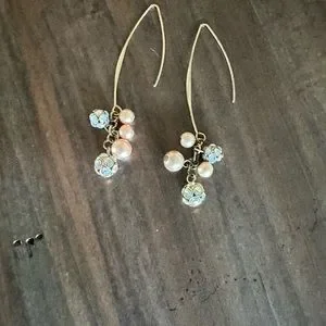 Elegant gold-tone earrings with a unique long hook design. Features clustered beads in blush pink, faux pearl, and iridescent rhinestone balls. Lightweight with lots of sparkle and movement — perfect for dressing up or adding flair to everyday looks.