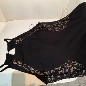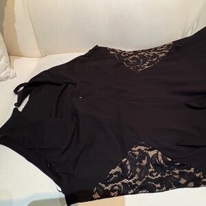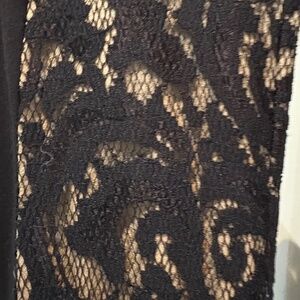Beautiful, curve flattering gown. Rayon/spandex combo. Single button back neck closure, back zip. Deep front slit. Lace inset. Built in bra.
