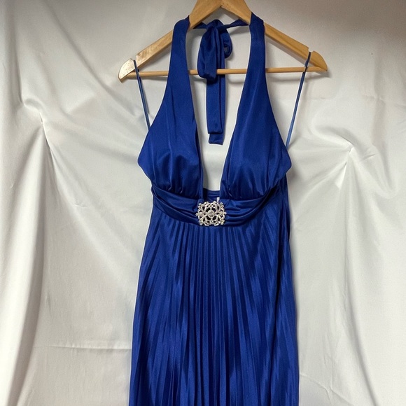 Royal Blue Halter Dress with Pleated Skirt and Rhinestone Broach; New With Tags; Side Zip; 100% Polyester