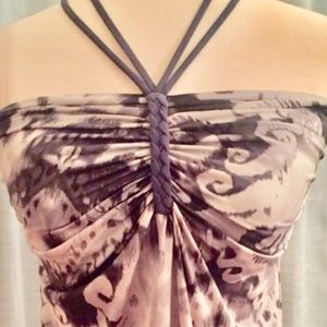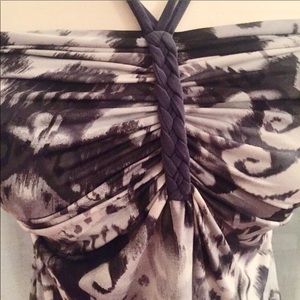 Cache Shades Of Gray Print Halter Top. Features a built in shelf bra. Fitted through the bust with a fit and flare finish through the body.