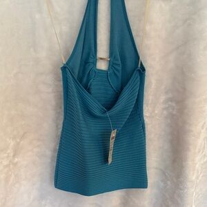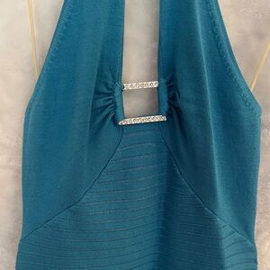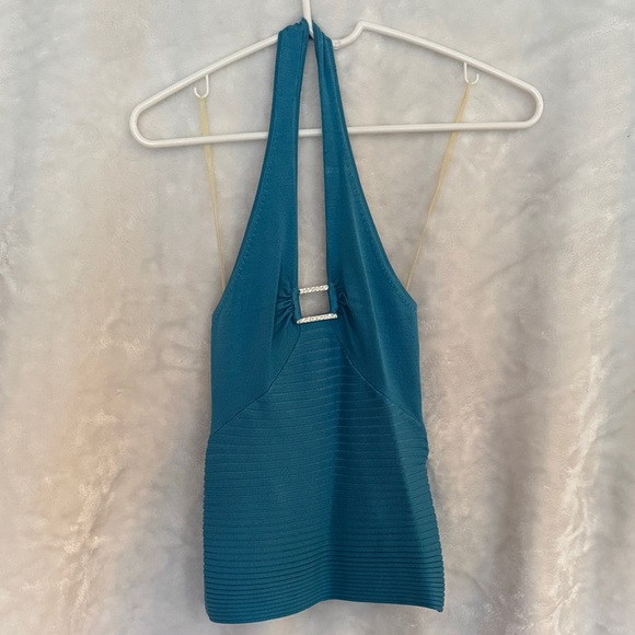 Brand new with tags vintage Cache halter top that is perfect for the summer or your next night out! Teal blue color with very stretchy material and and a rhinestone studded bar at the chest. ๐