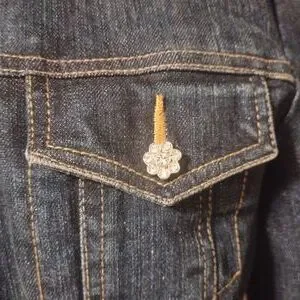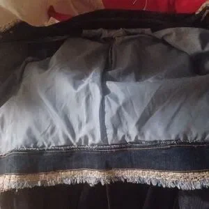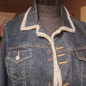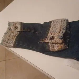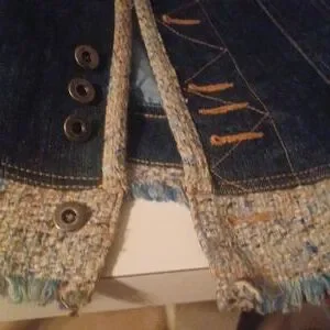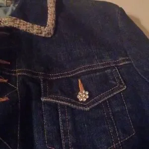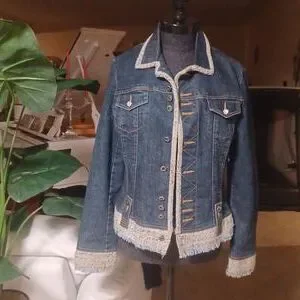 Denim and tweed trim, fitted stretch, rhinestones buttons on front chest pockets, contrast stitching on buttons hole, tweed with fringe trim at hemline, absolutely a stunning denim jacket (my favorite) its smaller for me now, good condition.