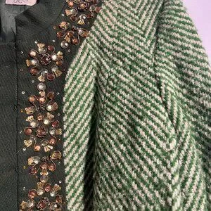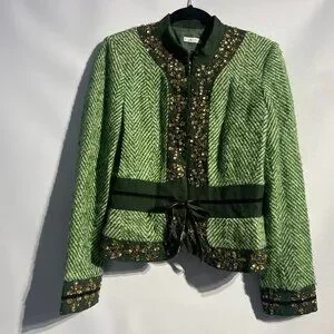 Cache green and white wool blend blazer, sequined trim accents. Size 2.
