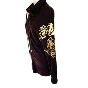 Brown zipper front jacket with gold metallic floral pattern with sequins.