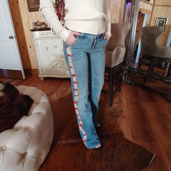 Cached jeans with some beautiful beading white pearls red beads lots of detail.