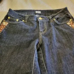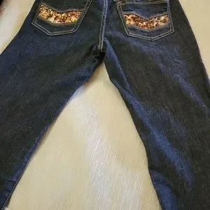 Flared jeans with bling,they are machine washable. Made of 93%cotton 3%Spendex...very good shape