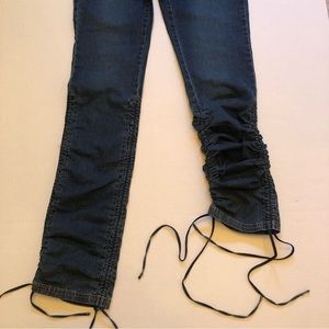 Cache’ Jeans size 6 medium wash adjustable extra long legs that draw string up or down. Longest length 36”