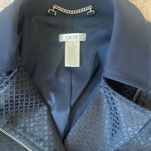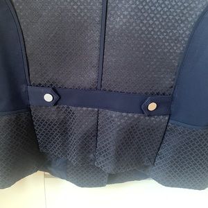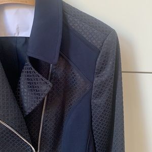 Ladies two toned embossed navy jacket with angled full front zip with zip openings on both sleeves