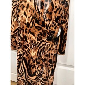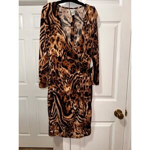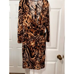 Cache Leopard Animal Print Faux Wrap Dress Long Sleeve Brown Black Medium