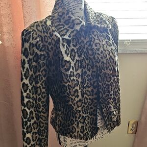 Chic Cache teddy jacket with bold leopard print. Soft and stylish for any occasion.
