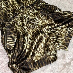 Statement leopard print romper by Cache with a chic utility-inspired design. Features a collared neckline, snap-button front, adjustable waist tie, and functional zippered pockets. Structured yet flattering with a bold, confident vibe.