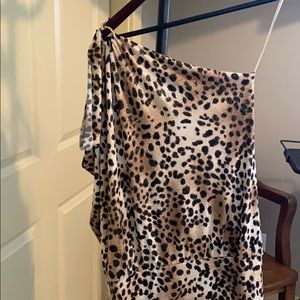 Cache size small Leopard print off the shoulder fitted dress. Gold hardware details on one shoulder. The other is bare. Very cute party dress. Used it once. No flaws. Gold thread fabric with print.
