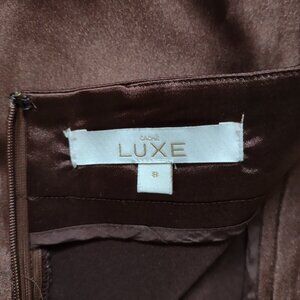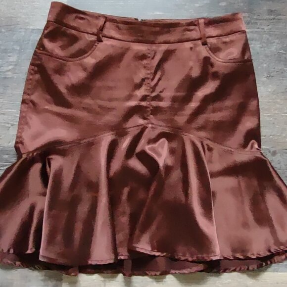 Luxurious Satin-like Fabric, Copper-Brown Short Skirt with flaired Bottom, Zipper-Back Waist has loops for a belt. Size 8 by Cache Luxe.