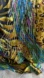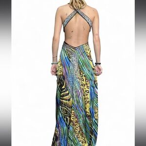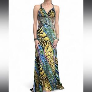 Eye-catching multicolor maxi dress with bold yellow animal print and blue-green striped accents. Flattering V-neck and crisscross bodice create feminine shape. Lightweight, flowy fabric for comfortable all-day wear. Perfect for evening events or summer outings.