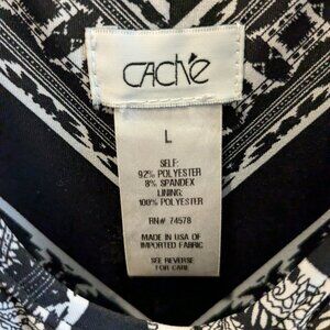 Designed with a retro chevron pattern, this blousson-style Cache Maxi Dress in women's large offers comfort and elegance. Made from stretchy material, it features adjustable straps and a fully lined interior for a customizable fit. Measurements include a 16-inch unstretched elastic waist, 20 inches from armpit to armpit, 50 inches in total length from center back to bottom, and a 40-inch length from the elastic waist.