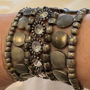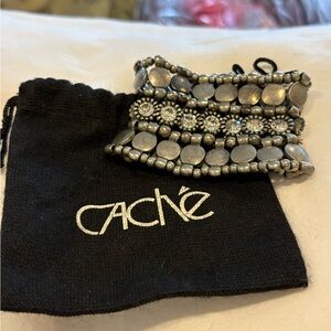 Stylish metallic cuff by Cache. Features layered beads and intricate design.