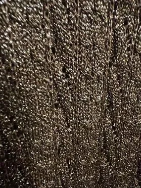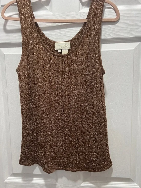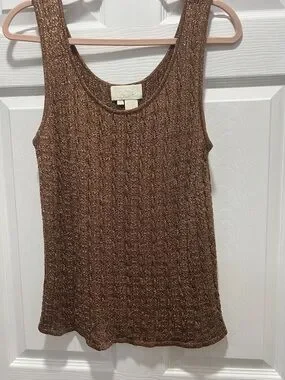 Sleeveless ribbed tank with metallic shimmer. Soft knit fabric with subtle texture. Versatile for day or night styling.