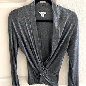 Cache Long-sleeved Metallic Top in Dark Gray. Crossover front with beautiful black and crystal accent piece. Shirred sleeves. Hand wash. Perfect for a night out with jeans or faux leather pants!