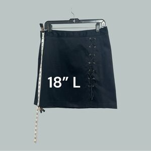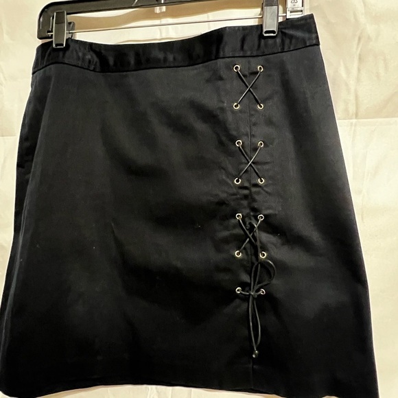 Cache Mini Skirt Black with Offset Faux Lace Up Loops Shoestring Tie Size 10 Measures 18” length, Zipper in back, 100% Cotton, No Stretch, Like New condition