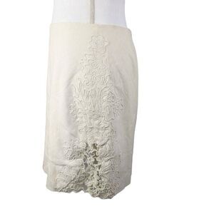 Cache Mini skirt 6 Polyester Lace Embroidered Zipper With hook and eye closure Floral embroidered sides. Measurements Waist- 15 inches Hips-19.25 inches Length- 16.75 inches Polyester style number 5036. This skirt would be a great fit for date night,or going out. Gently used with small flaws small pin size hole in back of skirt noted in photos.