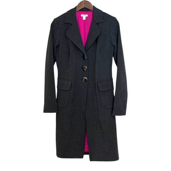 This stylish Cache gray jacket features a long button-front design, perfect for adding sophistication to any outfit. Ideal for cooler days, it offers a sleek look that suits various occasions.