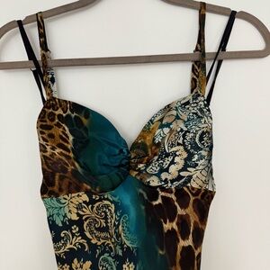 Elegant Cache dress with intricate patterns. Features a mix of animal and floral designs. Perfect for a stylish outing.