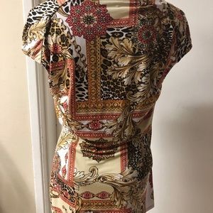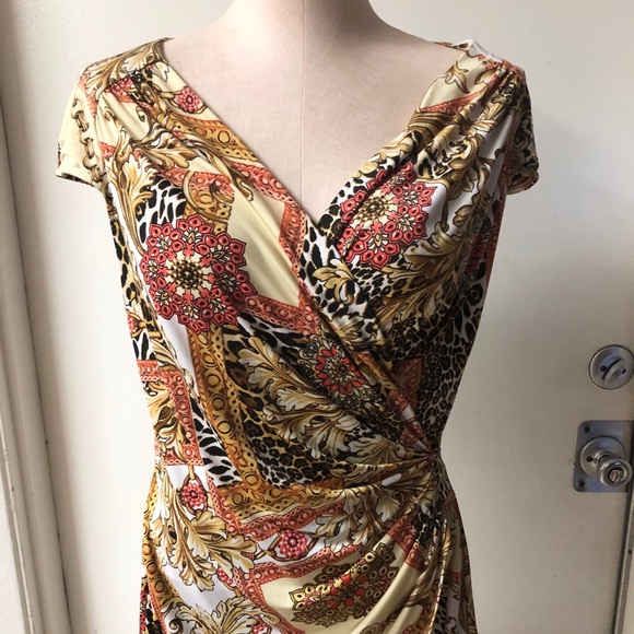 Elegant wrap top with vibrant patterns. Features a mix of floral and abstract designs. Perfect for a stylish look.