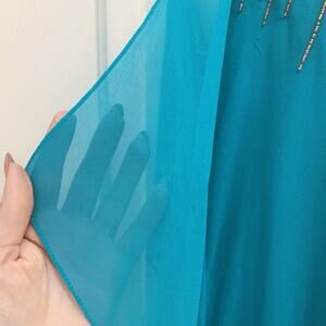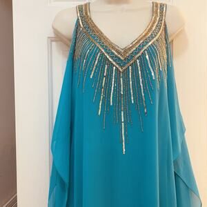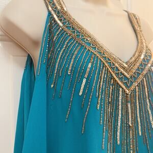 Elegant Cache cocktail dress, new with tags. Features a flowy turquoise chiffon overlay with a V-neckline and stunning gold sequin and bead embellishments at the neckline and hem. Sleeveless with a flattering, loose-fit silhouette and draped sides for added movement and drama. Perfect for evening events, weddings, parties, or special occasions.