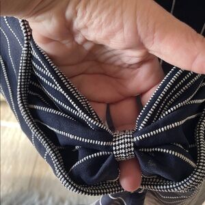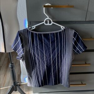 Chic navy blouse with white stripes. Features a stylish knot-front design. Ideal for a modern look.