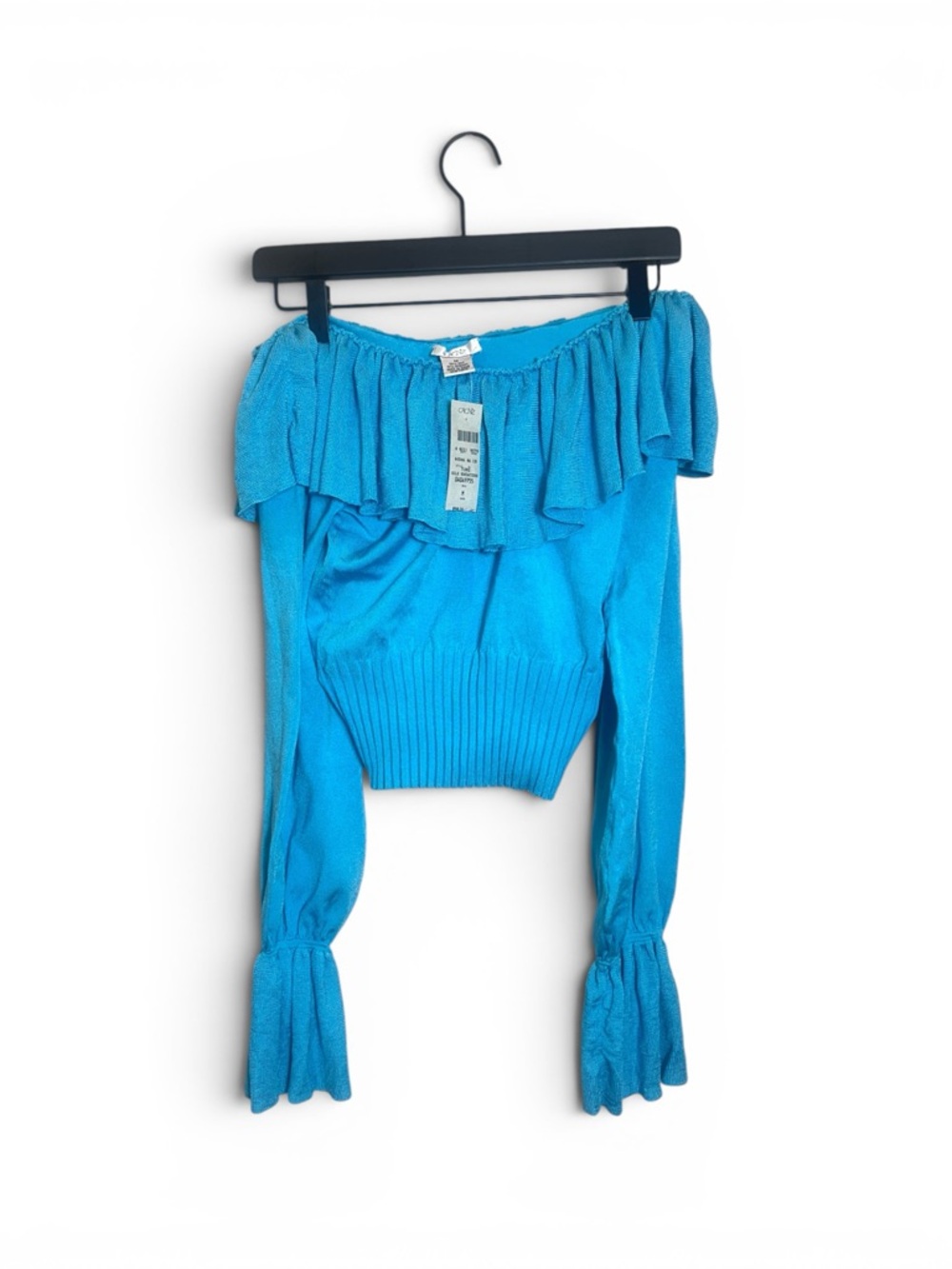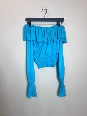 Off-shoulder ruffle neckline. Long sleeves with gathered detail. Lightweight silk knit fabric. Bright turquoise hue. Vintage new with tag. $98 MSRP