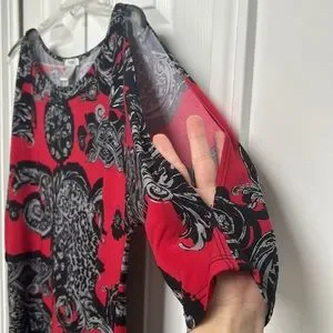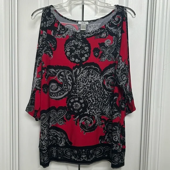 Patterned Cache blouse. Size M. Cold shoulder openings as shown and in excellent condition!
