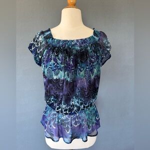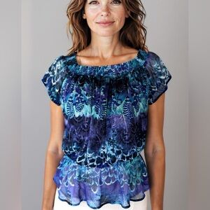 This blouse features a vibrant feather-like print in shades of blue, purple, and teal. It has a shirred, elasticized neckline that can be worn on or off the shoulders, creating a versatile look. The short, flowy sleeves are also elasticized at the cuffs. The waist is cinched with shirring, creating a peplum-style hem that adds shape to the garment. The blouse ismade of a lightweight, sheer fabric, likely polyester, and is lined.