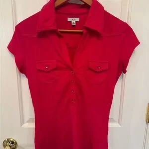 Stylish pink top with a collared design. Features button-up front and short sleeves. Perfect for casual or office wear. Very good pre owned condition.