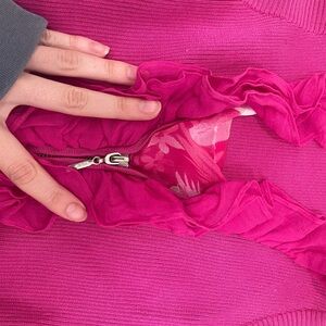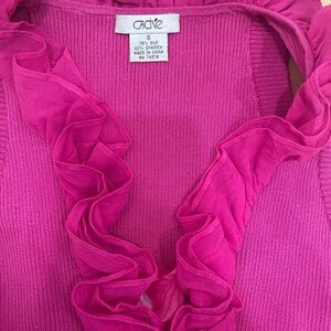 This Cache blouse in a vibrant pink hue features elegant ruffles cascading down the front, adding a touch of sophistication. The fitted design accentuates the silhouette, while the lightweight fabric ensures a comfortable fit. Perfect for elevating your style on any occasion. Silk