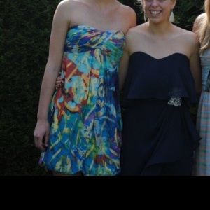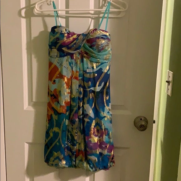 Size 0. Worn once, excellent condition. Teal background with gold designs. Sweetheart neckline. Zipper back. Padded front. Elastic border on chest area.