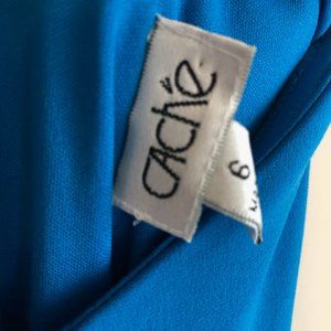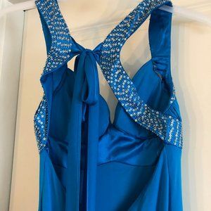Beautiful Cache brand prom dress with sequin top and tie in back. Floor length, form fitting. Size 6 -runs true to size. Gorgeous dress that is still in great condition. No rips, tears or stains. Dress fits snug all the way through the hips. Perfect in length with heels for someone 5'6".
