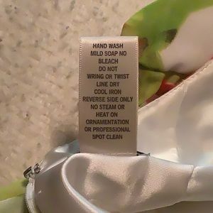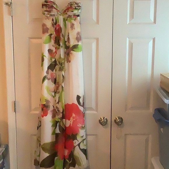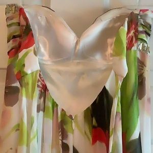 Cache Prom Dress is Light Layers of Flowy Polyester fully Lined; invisible zipper in back with bow closing the bust; rhinestone bead detailing at bust front. A sweet floor length dress, worn only once; very well cared for.