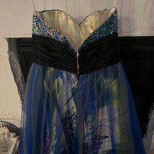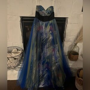 Multicolor prom dress with sequin top. The back hook “eye” fell off so it would need to be repaired. Worn for a few hours. Runs a tad big
