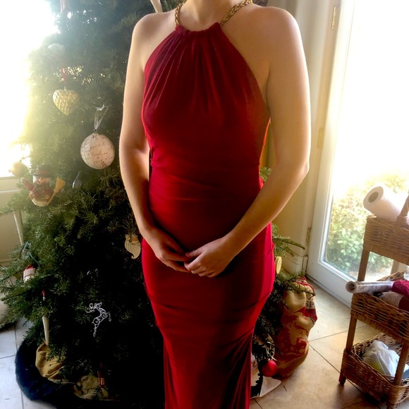 Cache red dress. Size 6. Worn once - hem is worn and stained. Would recommend hemming or dry cleaning. Halter chain top.